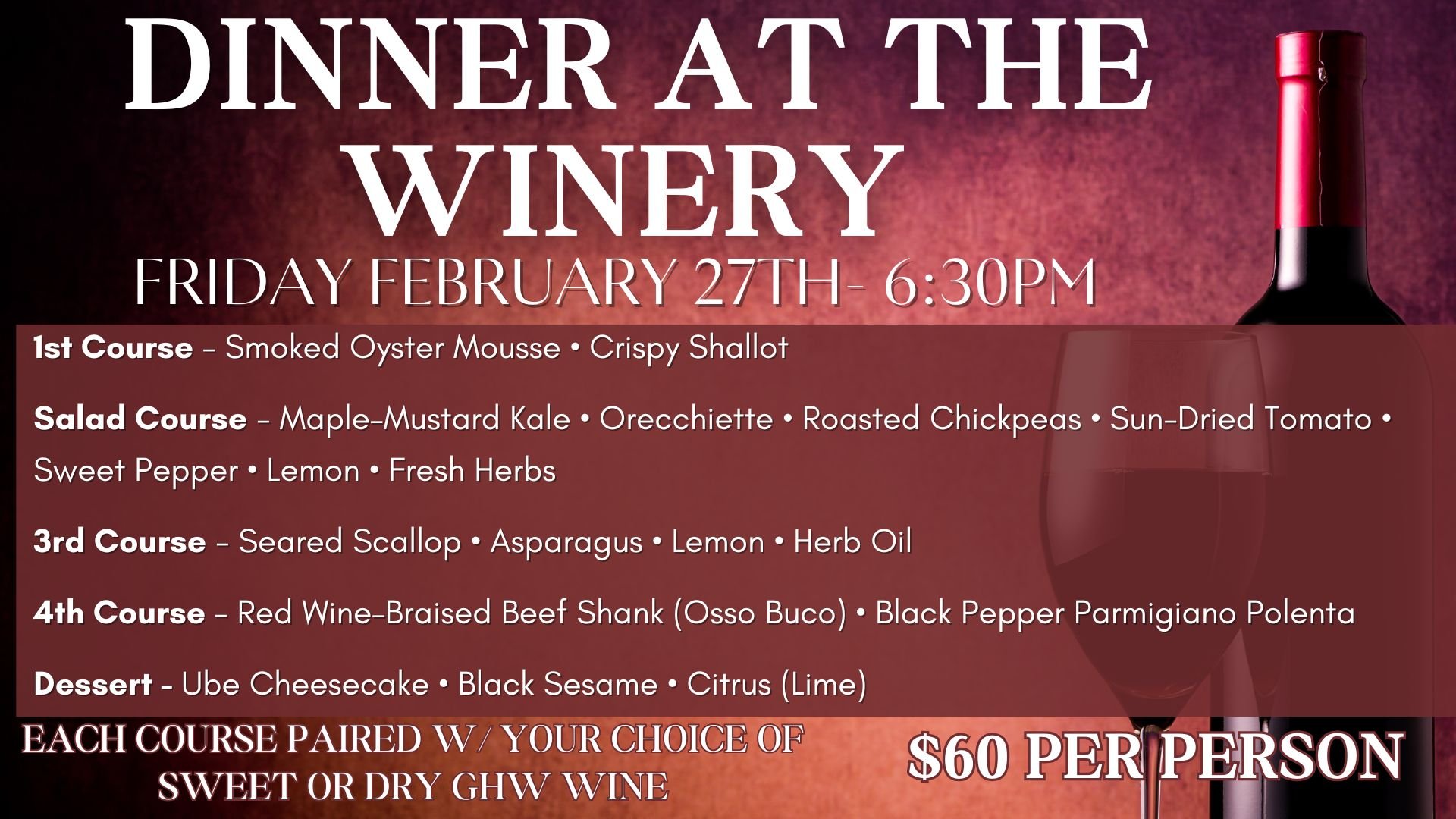Join us for an elegant five-course culinary experience at Grace Hill Winery on Friday January 30th at 6:30 PM.